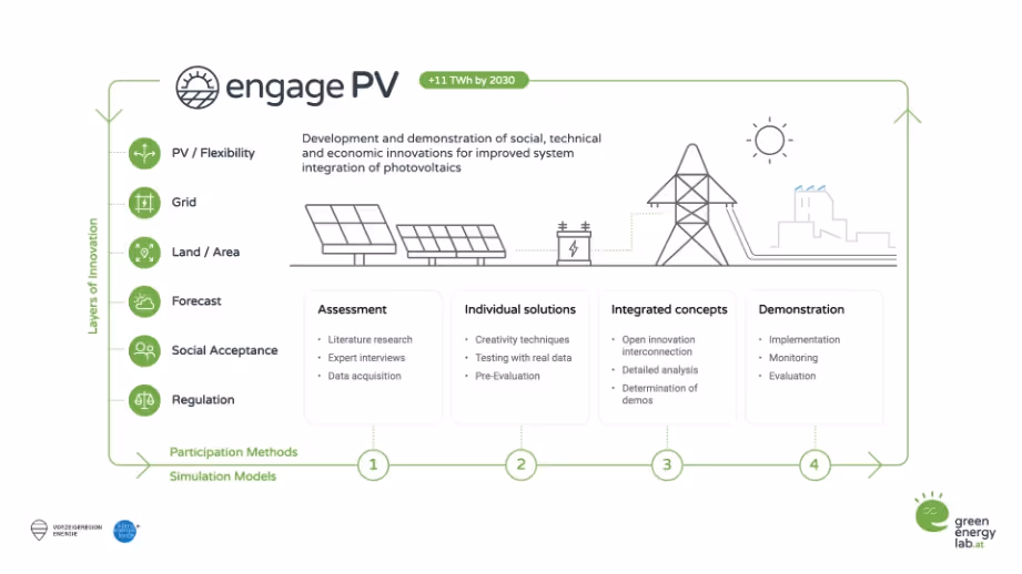 The project Engage PV aims to leverage the integration of photovoltaics systems through the development and demonstration of social, technical and economic innovations. Innovative individual solutions are to be found in various action fields, which will be networked into overall solutions and subsequently demonstrated.